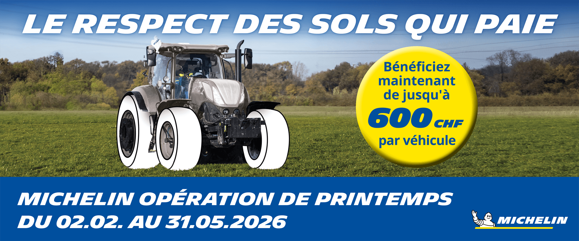 Pendant la période de promotion, achetez chez le revendeur de pneus de votre choix au moins deux pneus agricoles MICHELIN de 20 pouces et plus.